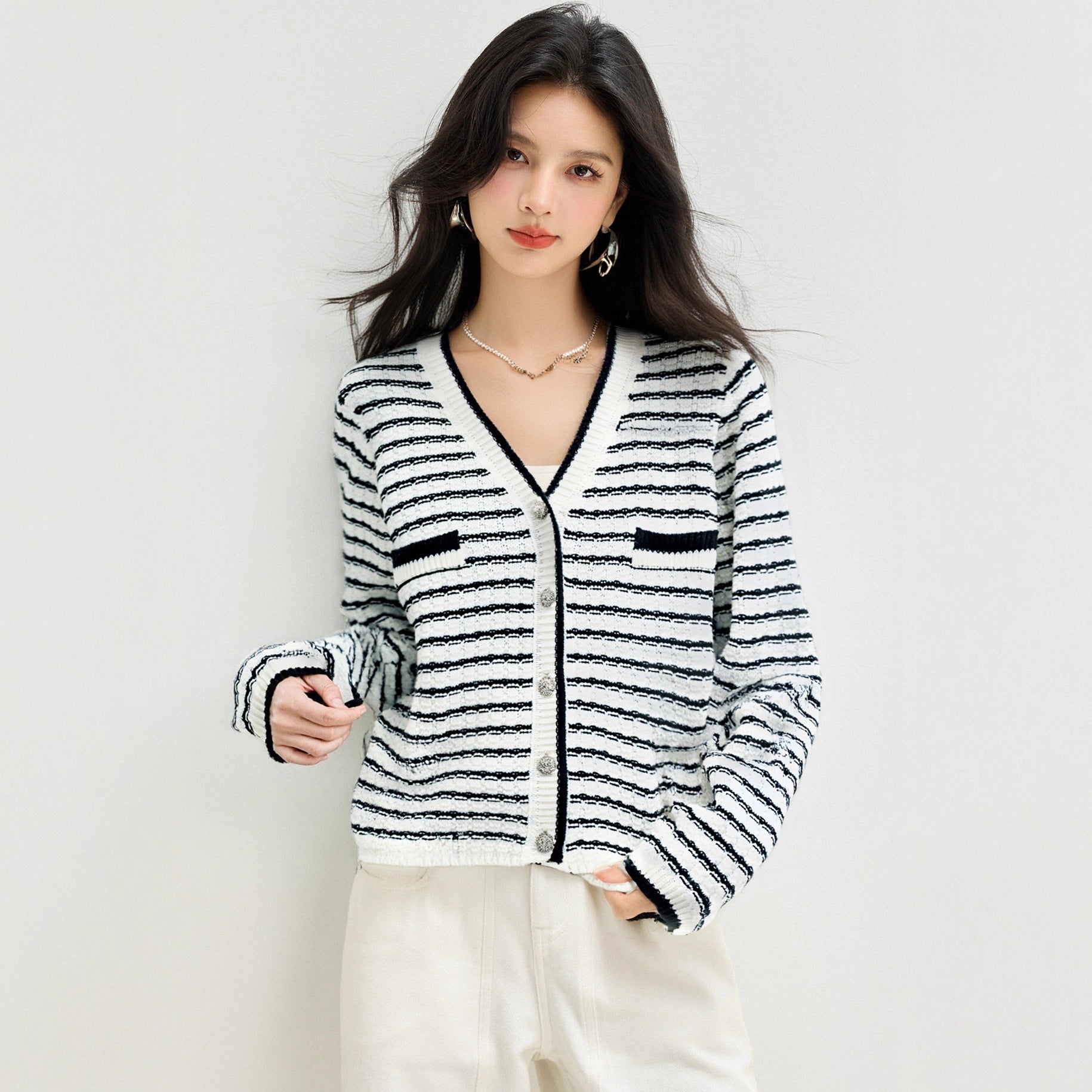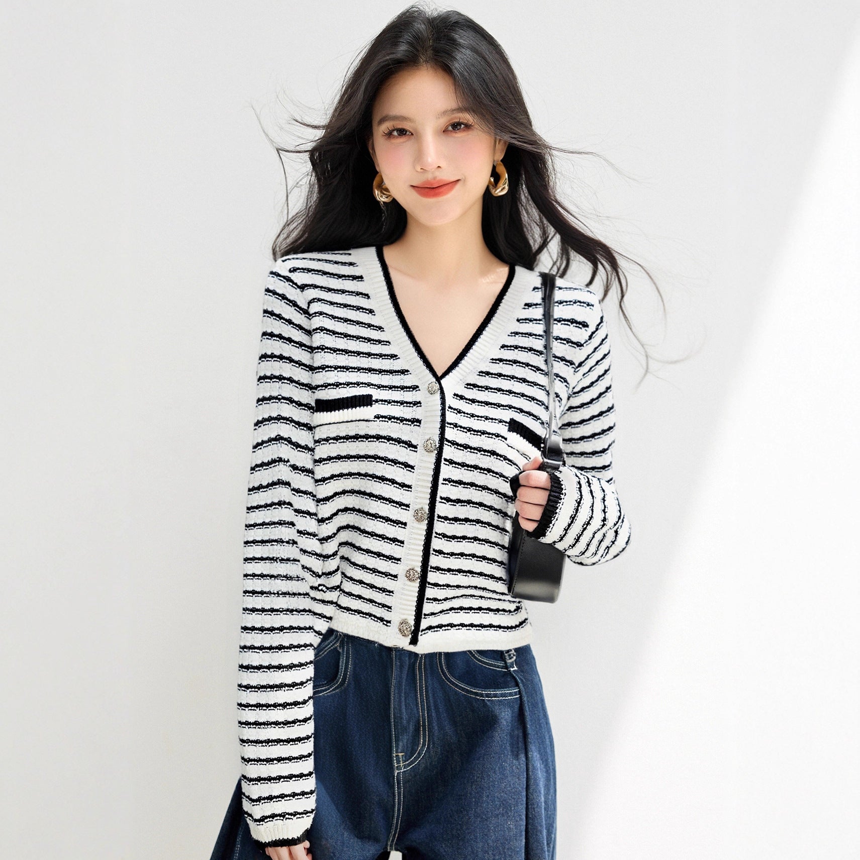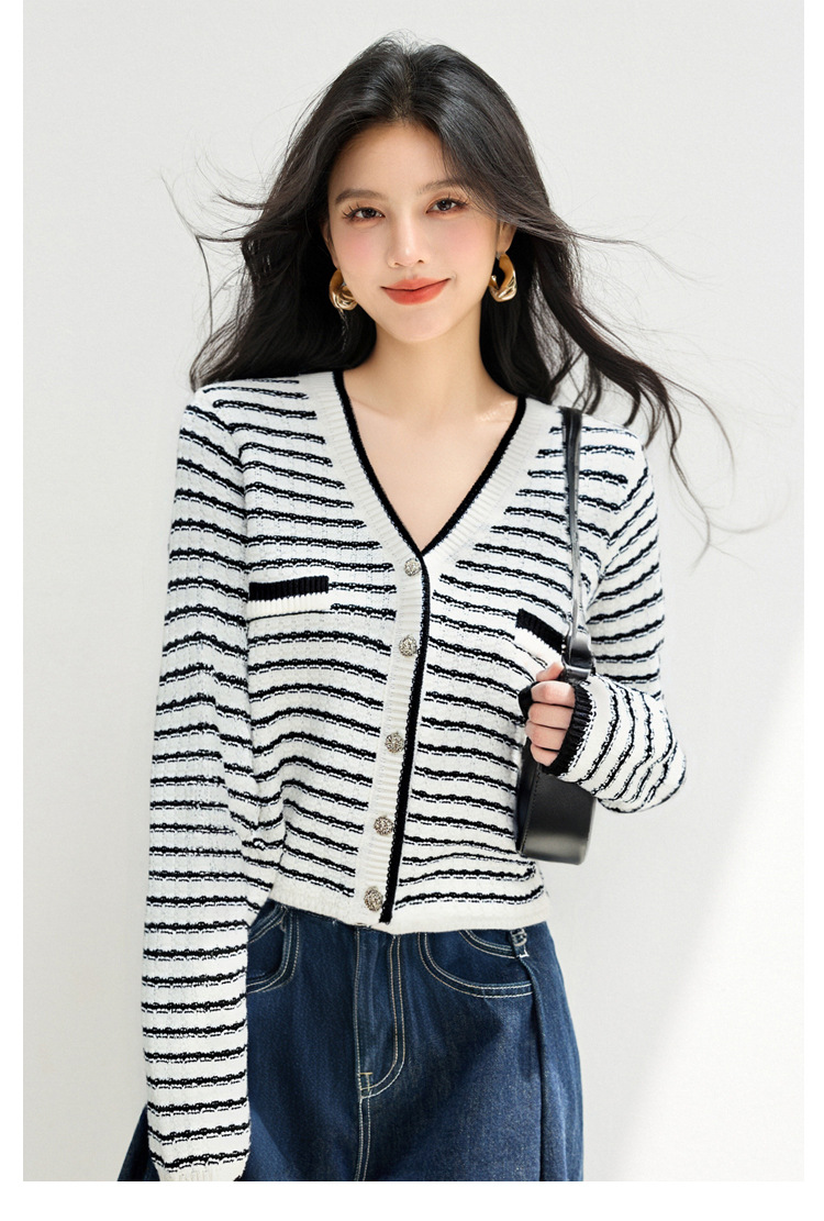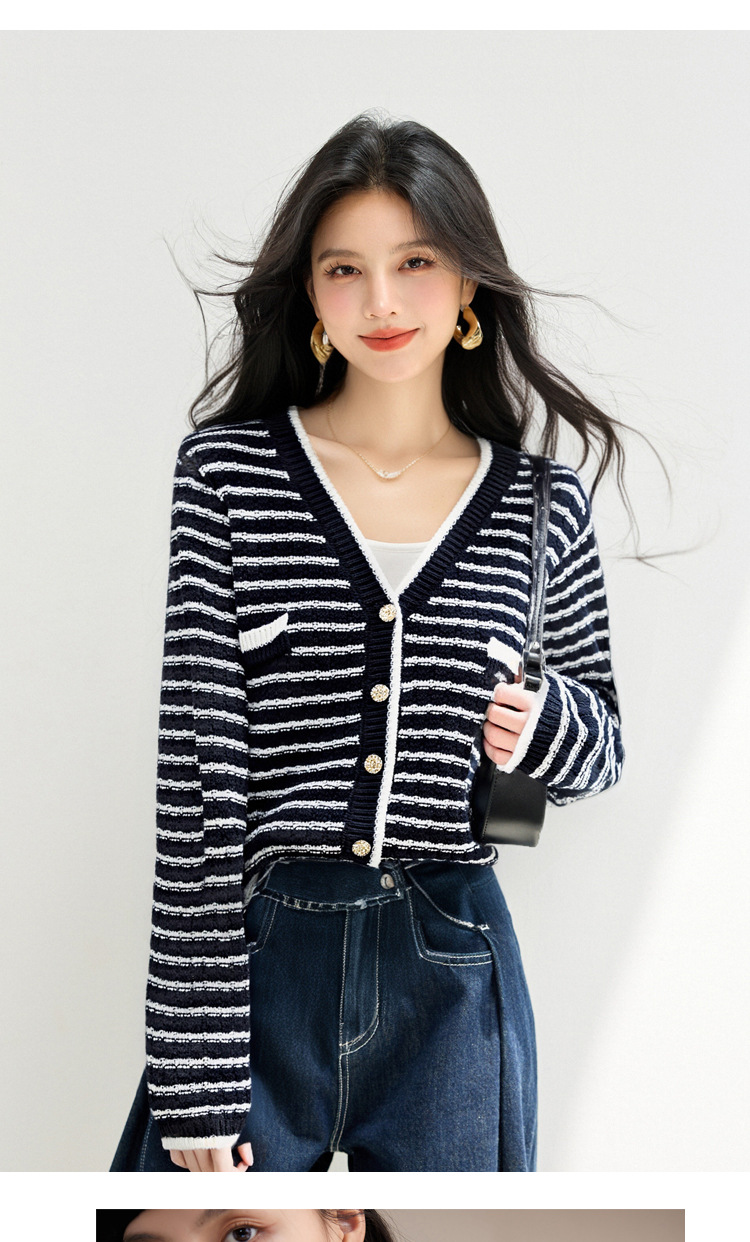 Style Minimalist Design Knit Top for Women, Stripe Cardigan, Charming V-Neck Sweater Jacket